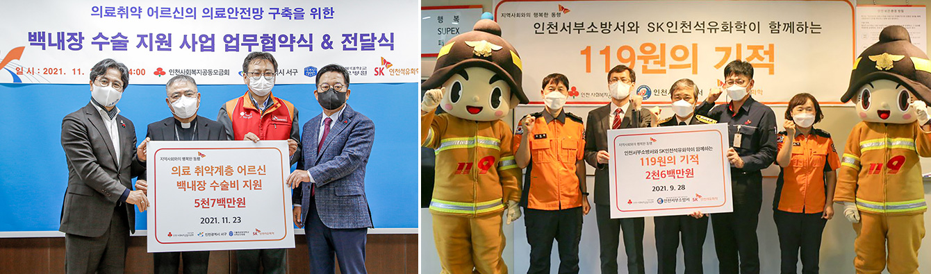 또한 SK인천석유화학은 지난 11월, 인천 서구지역 의료 취약계층의 백내장 치료와 의료 안전망 구축을 위한 업무협약을 체결해 백내장 수술이 필요한 노년층에 대한 경제적 지원의 발판을 마련했다. 앞서 올해 9월, SK인천석유화학은 인천 지역의 화재∙사고 피해자를 돕기 위해 인천소방본부가 추진 중인 ‘119원의 기적****’ 캠페인에 2년 연속으로 동참했다. ‘119원의 기적’ 캠페인은 9월 기준 총 3억 1천만 원 상당의 기금을 모아 인천 지역 화재 및 사고 피해자 45명을 지원했다.
