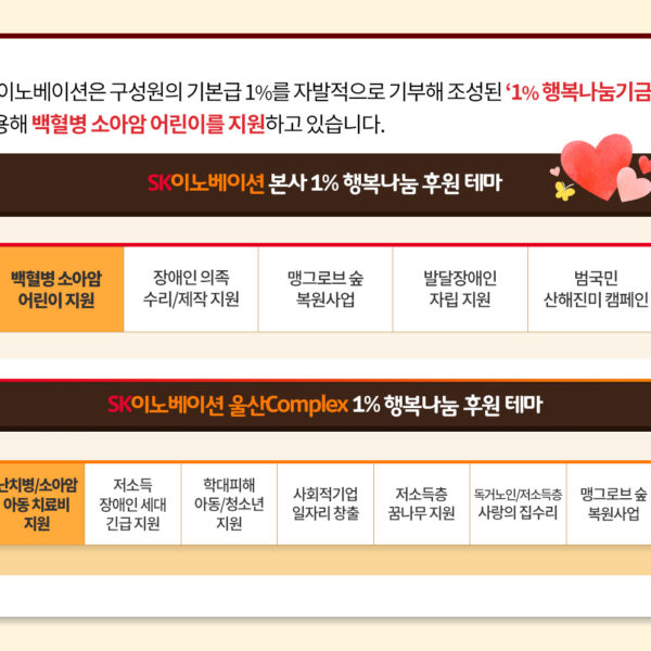 SK이노베이션 계열 구성원들의 나눔 활동은 2008년 ‘1인 1 후원 기부 프로그램’에서 시작돼, 2017년부터 자발적으로 기본급의 1%를 기부하는 ‘1% 행복나눔’ 기금으로 지속되고 있다. 지역사회와 상생하기 위한 구성원들의 마음이 모여 조성된 ‘1% 행복나눔’ 기금의 누적 모금액은 현재까지 총 117억 원을 돌파했다.