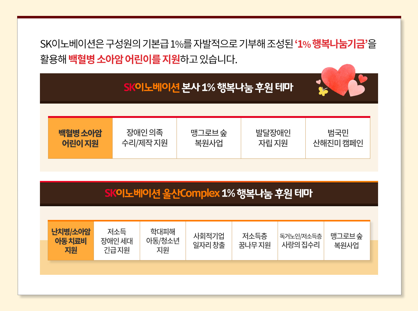 SK이노베이션의 본사와 주력 생산기지인 SK이노베이션 울산Complex(이하 울산CLX), SK인천석유화학을 중심으로 구성원 대부분이 ‘1% 행복나눔’ 기금에 참여하고 있으며, 조성된 기금을 통해 다양한 사회문제를 해결하는 데 힘을 더하고 있다.