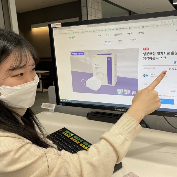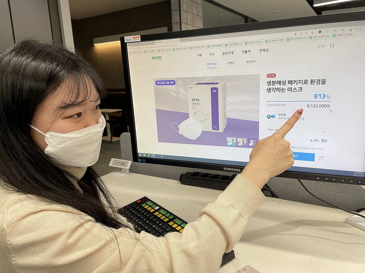 (사진3) SK이노베이션 구성원이 기부포털 사이트인 해피빈(happybean.naver.com/fundings/detail/F373)에서 ‘오투엠’의 건강/행복마스크 펀딩을 보고 있다.