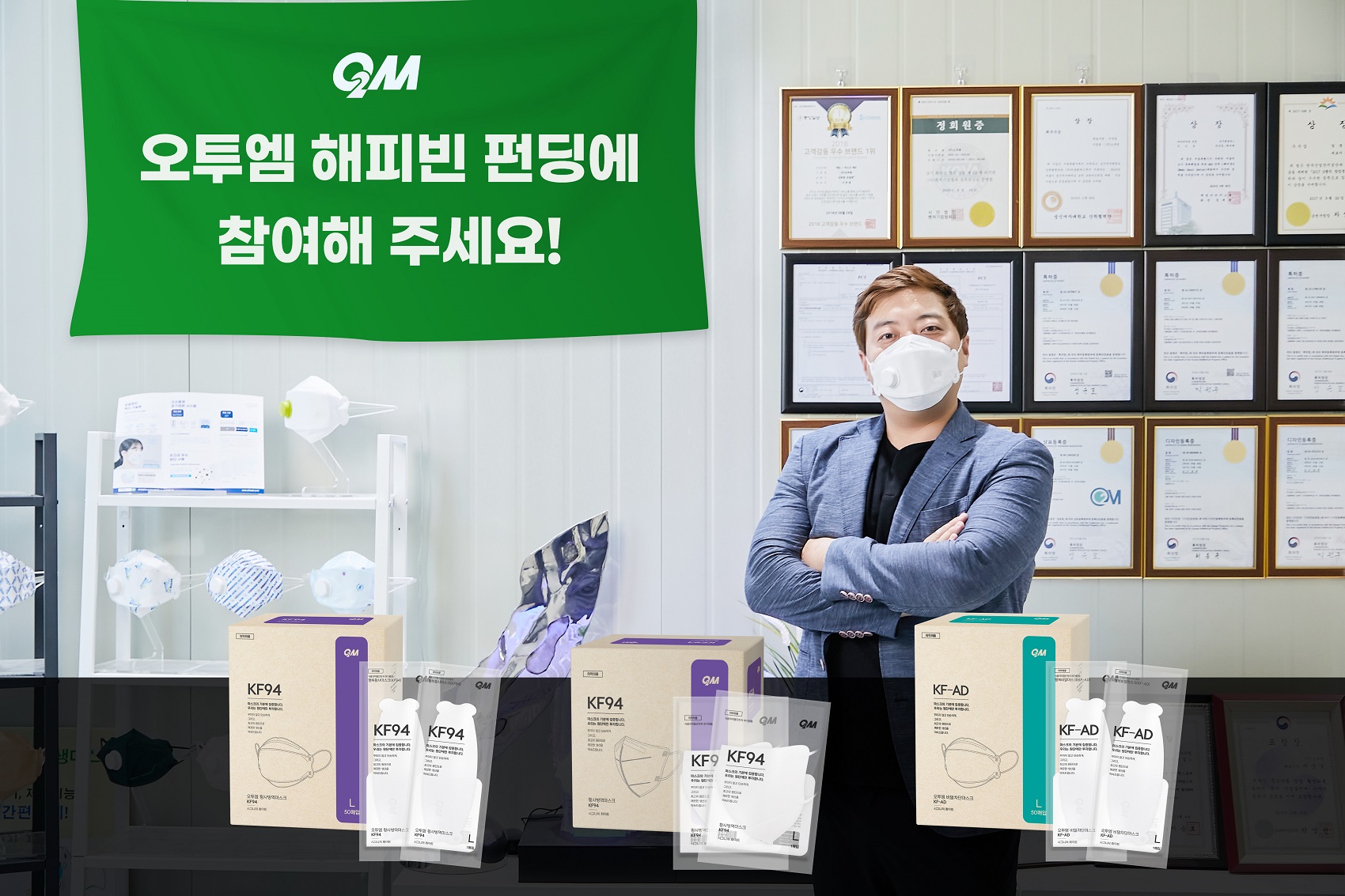 이번에 펀딩 참여하는 착한 소비자에게는 비말 감염 예방에 뛰어나면서 긴 시간 사용에도 숨쉬기 뛰어난 행복비말마스크, 비말과 미세먼지 등 감염원 차단에 뛰어난 황사방역 마스크 등을 리워드로 제공하게 된다.