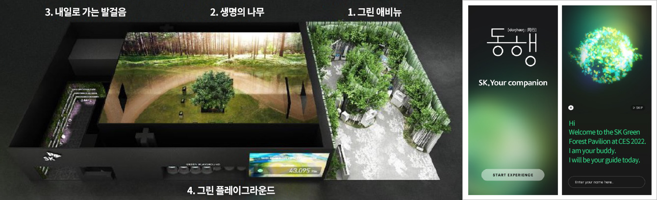 ▲ (좌) ‘CES 2022’ SK 전시관 ‘그린 포레스트 파빌리온’(Green Forest Pavilion) / (우) SK 전시관 관람객들에게 제공되는 도슨트 앱 ‘동행(Buddy)’