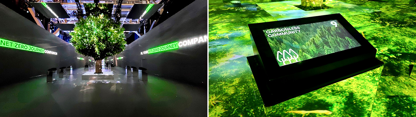 SK는 전시 주제인 ‘동행’의 취지를 살려 관람객들도 탄소 감축에 기여할 수 있는 기회를 제공했다. ‘내일로 가는 발걸음’ 구역은 환경을 살리기 위한 약속과 기부를 통해 깨끗한 미래를 만드는 SK의 넷제로 활동에 관람객들이 직접 동참할 수 있는 참여형 공간으로 만들어졌다.