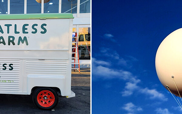 ▲ ‘CES 2022’ 기간 동안 SK의 파트너社 대체 식품을 맛볼 수 있는 푸드트럭(좌)과 푸드트럭 위치를 알려주는 애드벌룬(우)