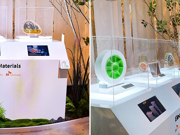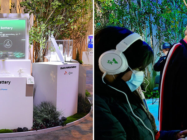 ▲ (좌) SK 전시관 ‘그린 포레스트 파빌리온’의 1구역 그린 애비뉴 – 청정 섹션을 통해 소개된 SK의 모빌리티 소재 기술력(좌측부터 SK아이테크놀로지의 LiBS, SKC의 동박, SK루브리컨츠의 전기차용 윤활유) / (우) SK의 모빌리티 소재를 체험 중인 관람객들