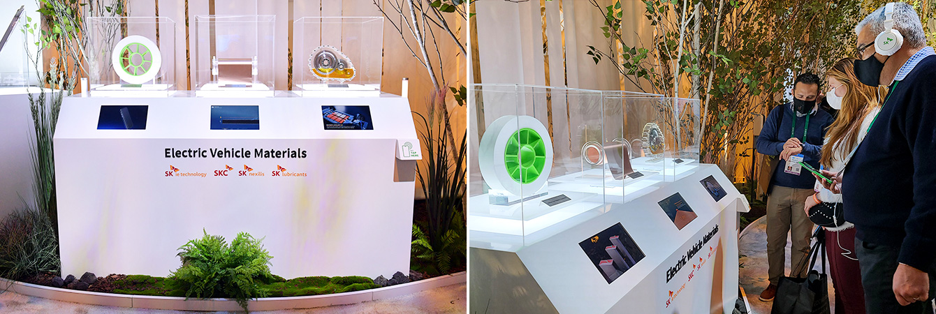 이 외에도 SK는 청정 섹션을 통해 전기차 배터리의 핵심소재인 리튬이온배터리분리막(LiBS)과 리튬이온배터리 음극재의 핵심소재인 동박, 전기차용 윤활유 등 SK의 미래 모빌리티용 소재들을 전 세계 관람객들에게 선보이며 클린 에너지에 대한 비전을 제시했다.
