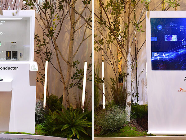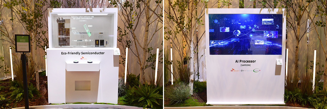 ▲ SK 전시관 ‘그린 포레스트 파빌리온’의 1구역 그린 애비뉴 – 편의 섹션을 통해 소개된 소개된 SK하이닉스의 친환경 반도체(좌)와 SK텔레콤의 AI 반도체(우)