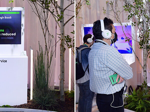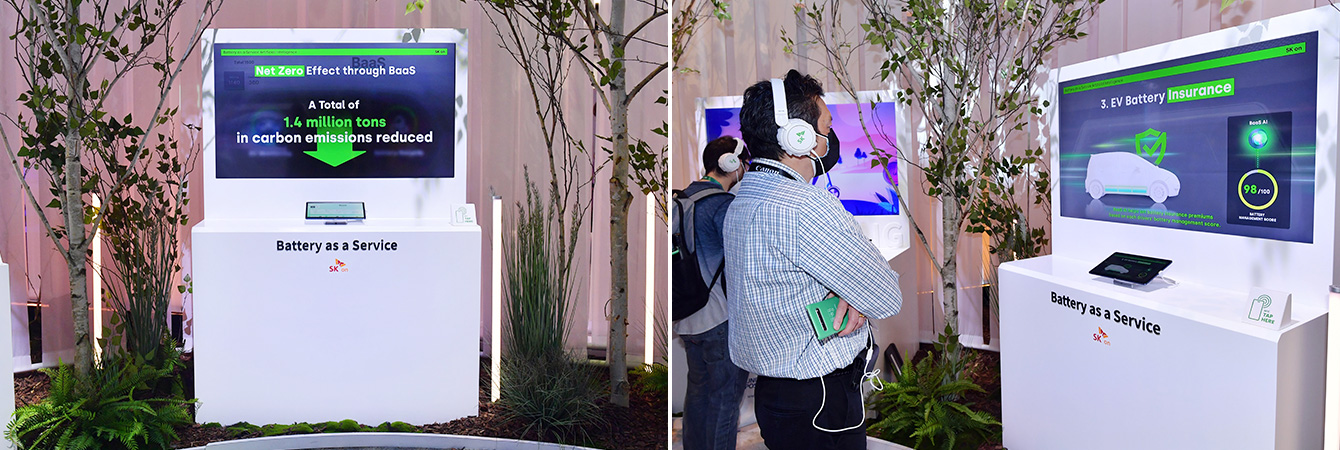 ▲ SK 전시관 ‘그린 포레스트 파빌리온’의 1구역 그린 애비뉴 – 안전 섹션을 통해 소개된 SK온의 BaaS(좌)와 이를 체험 중인 관람객들(우)
