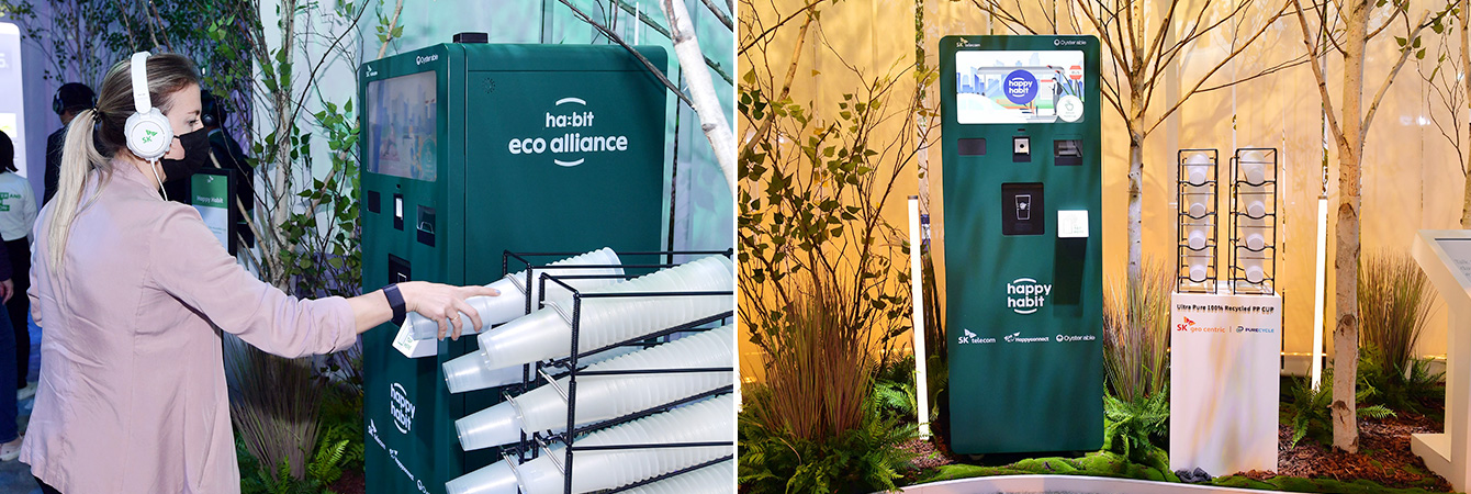SK텔레콤, SK지오센트릭 등이 함께하는 ‘해피해빗(Happy Habit)’은 리유저블(Reusable) 컵을 통해 일회용 플라스틱 컵 사용을 줄이자는 환경포호 프로젝트다. SK텔레콤은 사물을 인식하고 분석하는 비전(Vision) AI 기술을 통해 컵의 상태와 오염도 등을 정밀하게 인식함으로써 리유저블 컵의 회수율과 활용성을 높이고 있으며, 이를 통해 환경오염의 주범이 되는 폐플라스틱을 줄이고 탄소 배출량 감축에 일조한다.