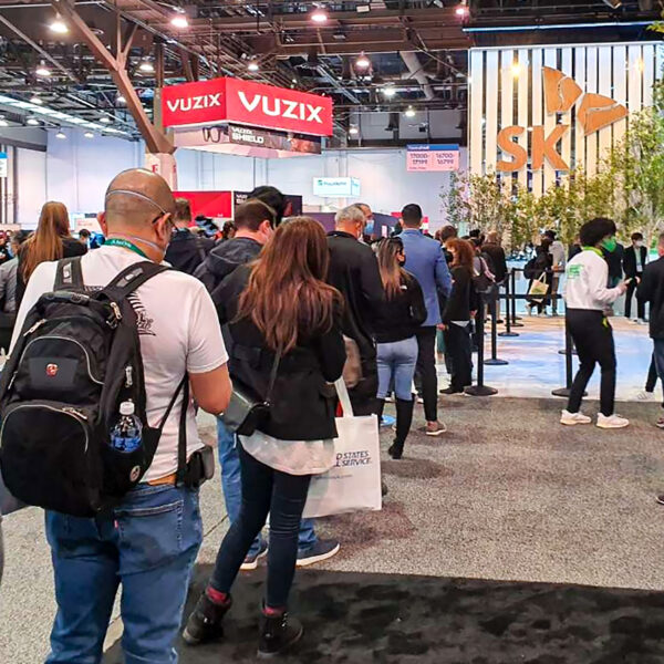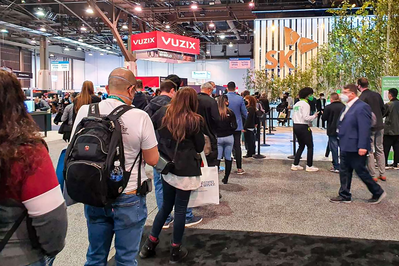 ▲ ‘CES 2022’ SK 전시관 ‘그린 포레스트 파빌리온’의 1구역 그린 애비뉴(Green Avenue)를 보기 위해 대기 중인 관람객들