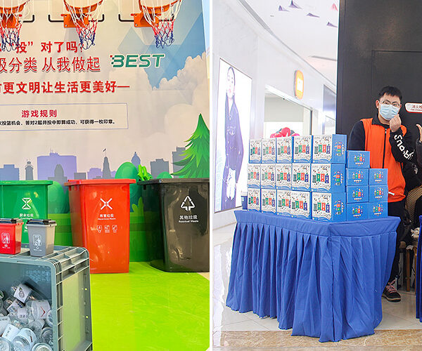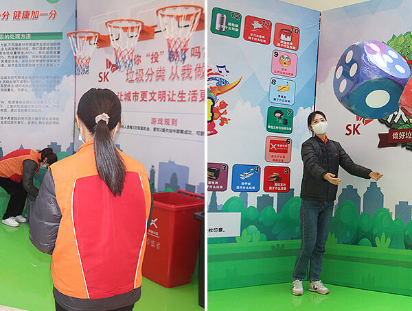 ▲ (좌) 중국 장쑤省 창저우市 진탄구 내 최대 쇼핑몰 우위에광장에 마련된 SKBMC 및 BEST의 ESG 활동 행사 부스 / (우) SKBMC 및 BEST 구성원들이 분리수거 캠페인을 알리고, 분리수거 전용 제품들을 소개하고 있다.