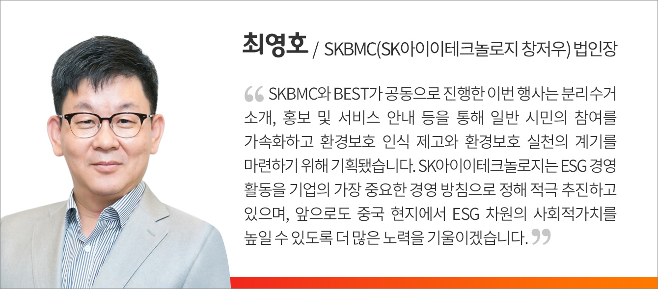 올바른 분리수거를 통한 ESG 가치를 전한 이날 행사는 SKBMC 및 BEST 구성원들의 열띤 노력으로, 진탄구 시민들의 뜨거운 관심과 호응/참여 속에 성공리에 마무리됐다. 행사 관계자들은 “앞으로도 환경보호 등 의미 있는 일에 기꺼이 동참해 힘을 더하고, 내 주변의 작은 것부터 시작하겠다”고 말했다.