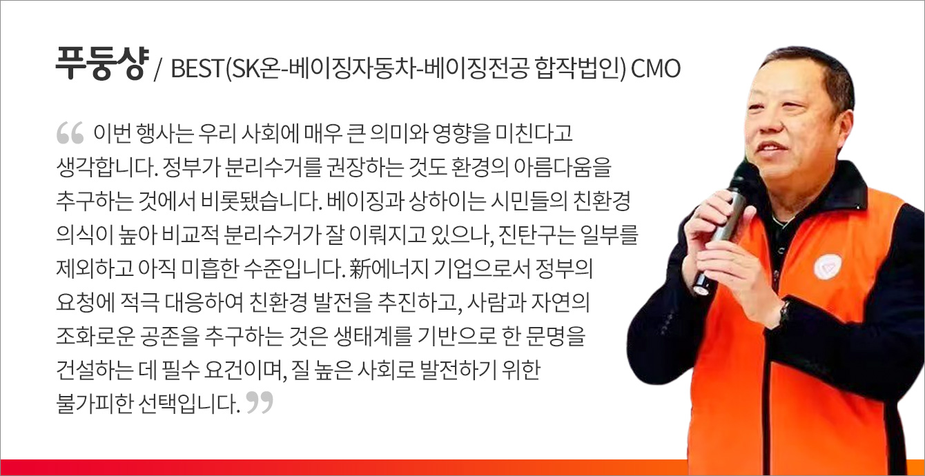 이날 행사는 창저우市 지역사회와 시민들에게 환경 오염 및 생태계 균형에 대한 관심을 촉구하고, 환경보전 의식을 높이기 위한 취지로 마련됐으며, 유동인구가 많은 창저우市 진탄구 내 최대 규모 쇼핑몰인 우위에광장에서 진행됐다. 이 자리에서 SKBMC와 BEST 구성원들은 “나부터 쓰레기 분리수거를 시작하자”, ”지구를 지키기 위해 함께 새로운 문화를 만들어가자” 등 일반 시민에게 캠페인을 알리고, 지속가능한 미래를 위한 캠페인에 동참할 것을 촉구했다.