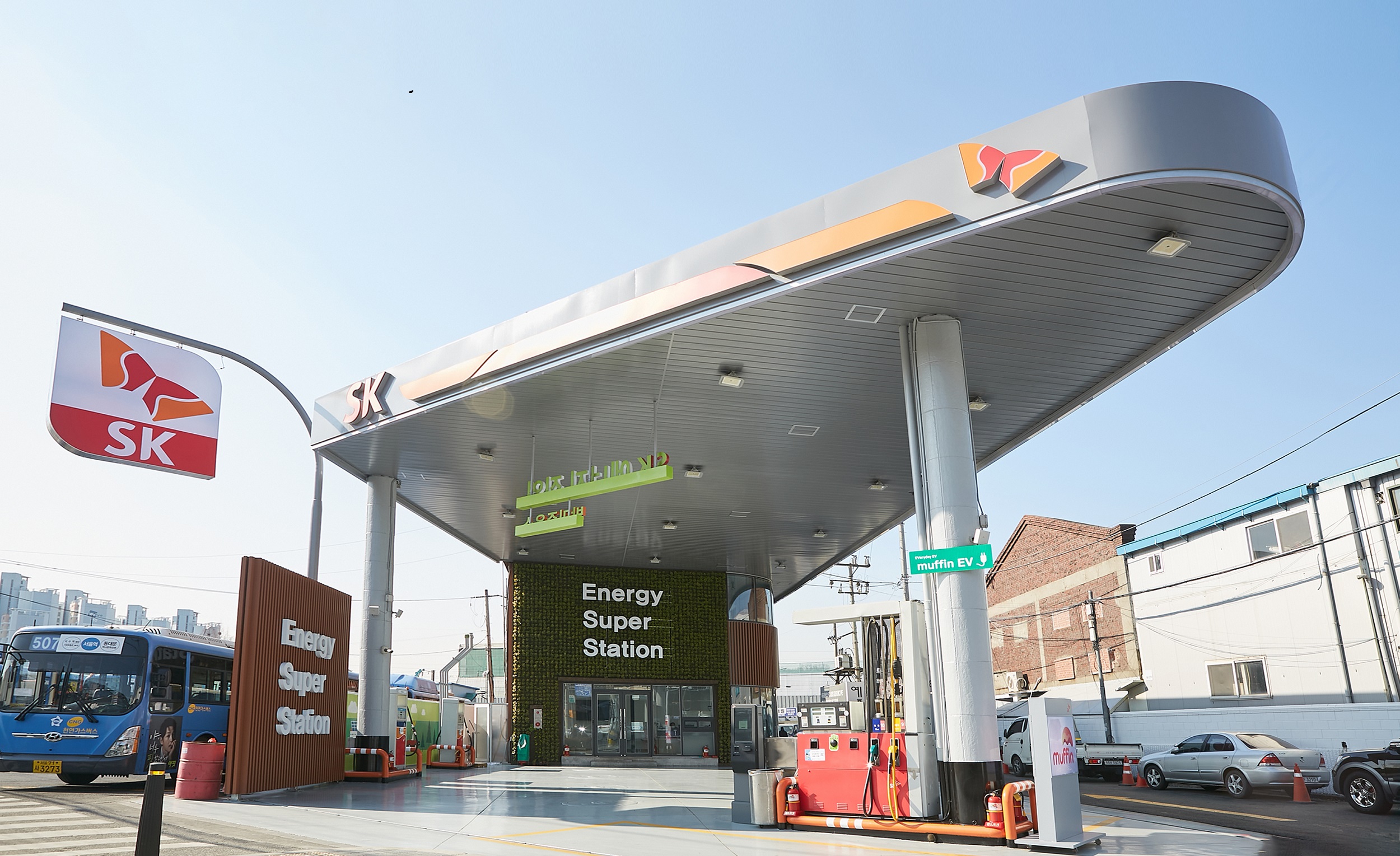 SK 박미주유소에 설치한 ‘에너지 슈퍼스테이션’은 태양광(20.6kW)와 연료전지(300kW) 발전 설비를 통해 친환경 전기를 생산한다. 현재는 SK에너지가 생산된 전기를 한전에 판매하는 형태이나, 관련 법령 정비 후 생산된 전기를 초급속/급속 전기차 충전기 2기(350/100kW)에 공급할 예정이다. 향후 전기차 운전자들은 친환경 발전 설비로 만든 ‘친환경 전기’로 전기차를 충전하게 된다.