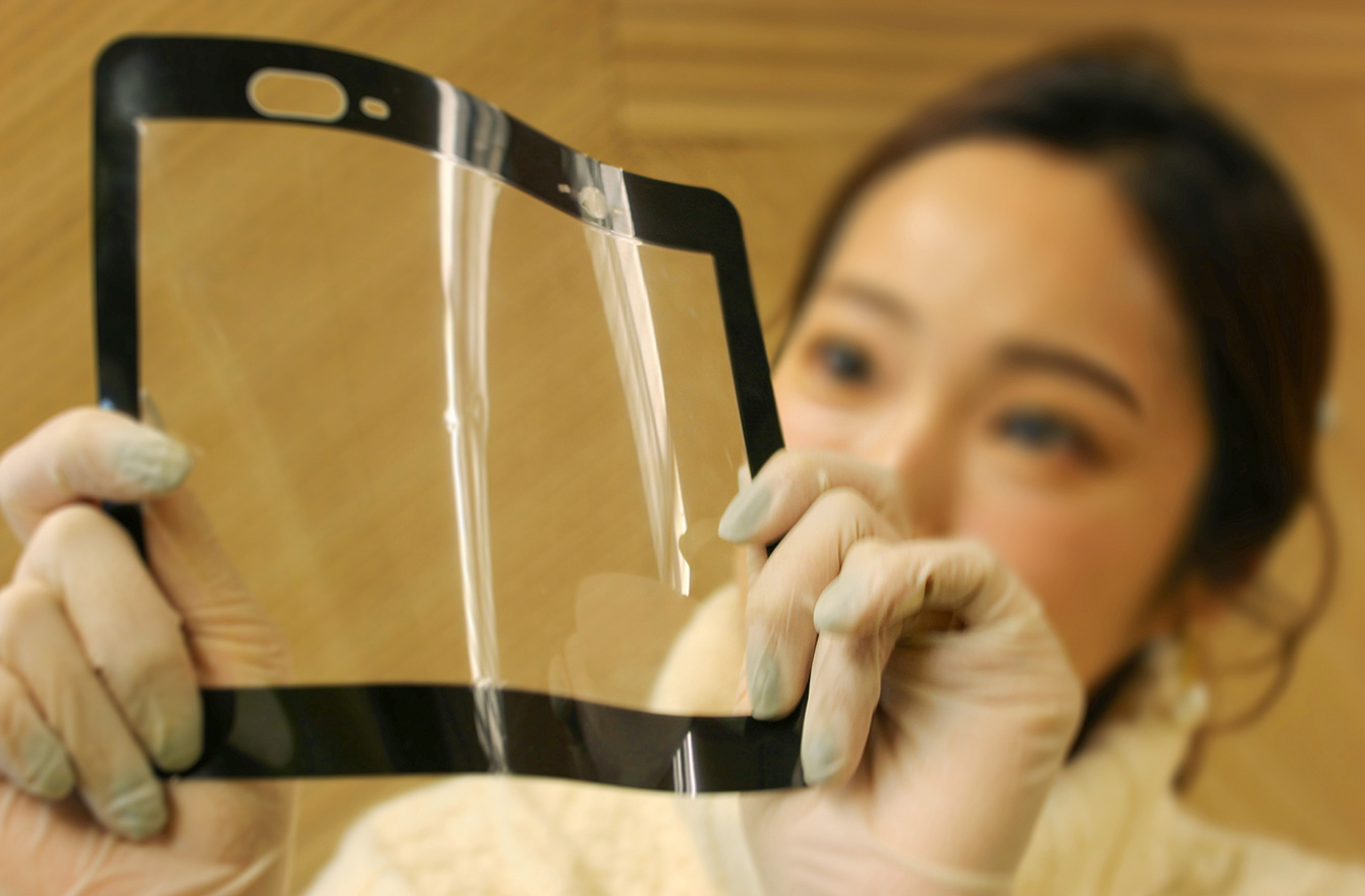 ▲ SK아이이테크놀로지가 개발한 FCW 제품. 높은 수준의 접힘성(Bending)과 강도, 내스크래치(Anti-scratch) 특성을 갖고 있다.
