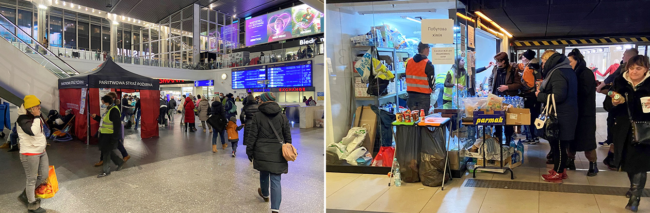 ▲ 폴란드 바르사뱌역(좌측)과 카토비체역(우측)에서 진행 중인 우크라이나 난민 지원
