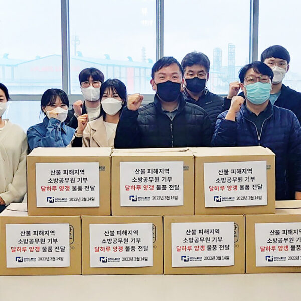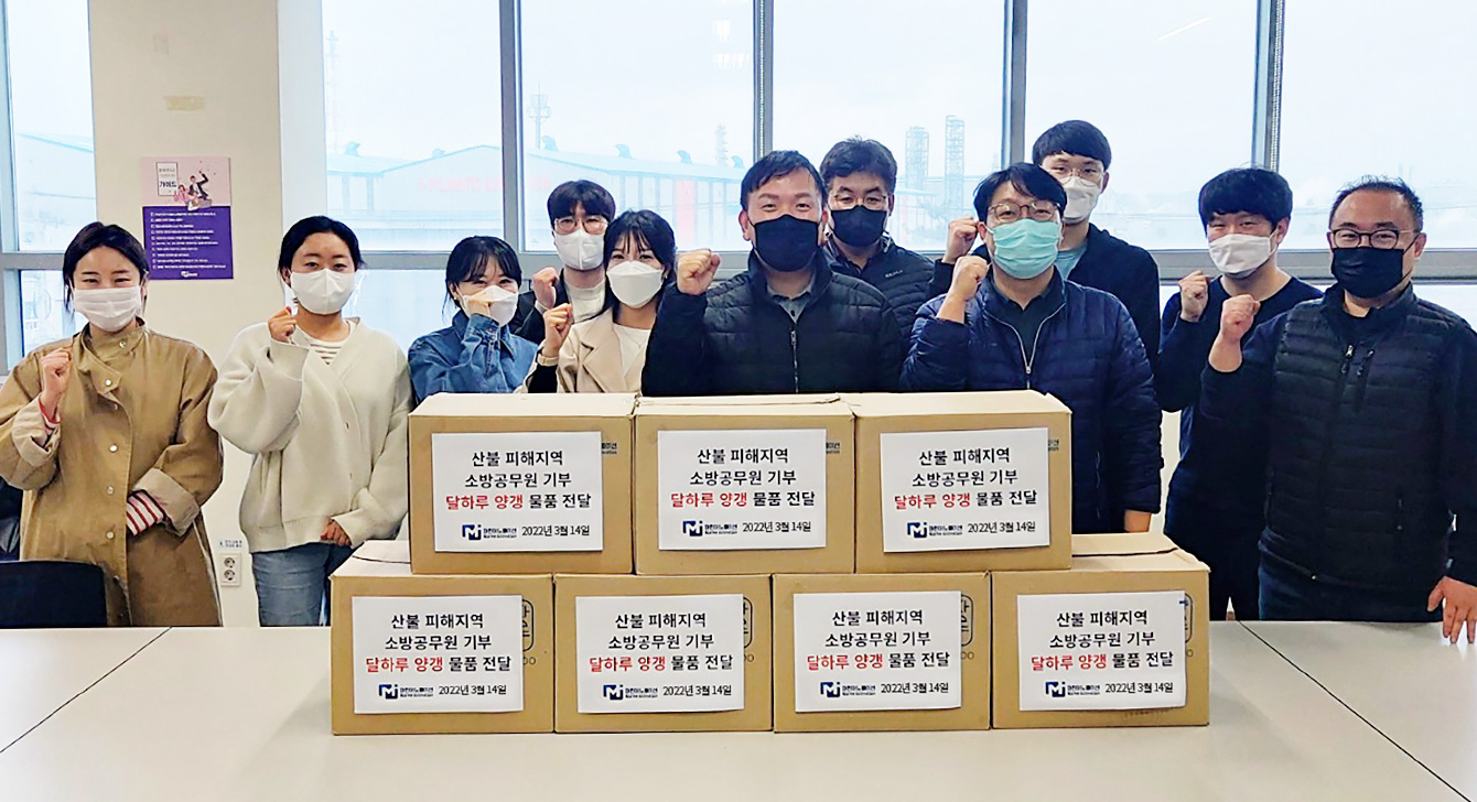 SK이노베이션이 육성 지원하는 친환경 소셜벤처 ‘마린이노베이션’이 3월 15일, 최일선에서 울진·삼척 산불을 진압한 소방공무원들의 노고에 감사를 표하기 위해 우뭇가사리에서 추출한 한천으로 만든 ‘달하루’ 양갱 350세트(525만원 상당)를 기부했다. 이는 대한적십자사를 통해 산불 피해 지역의 화재 진압과 현장 복구에 힘쓰는 소방공무원들에게 전달될 예정이다.