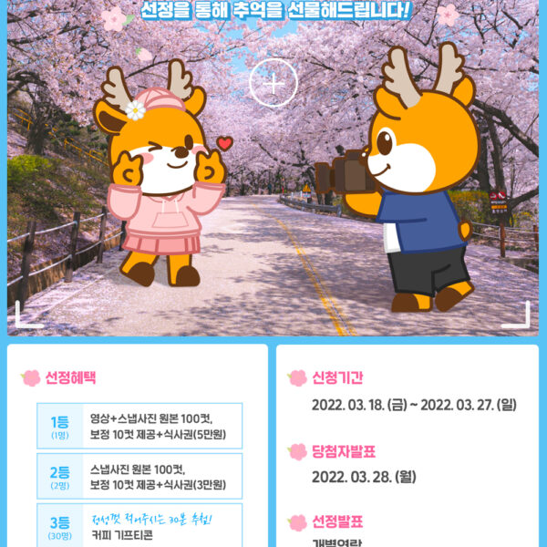 서구 SNS를 통해 사연을 보내면 참가자 중 3팀을 선정해 이벤트에 참여하는 방식으로 진행된다. 선정된 구민은 벚꽃이 만발한 벚꽃동산을 마음껏 거닐고 벚꽃동산을 배경으로 전문 사진작가가 촬영한 사진을 받을 수 있다.