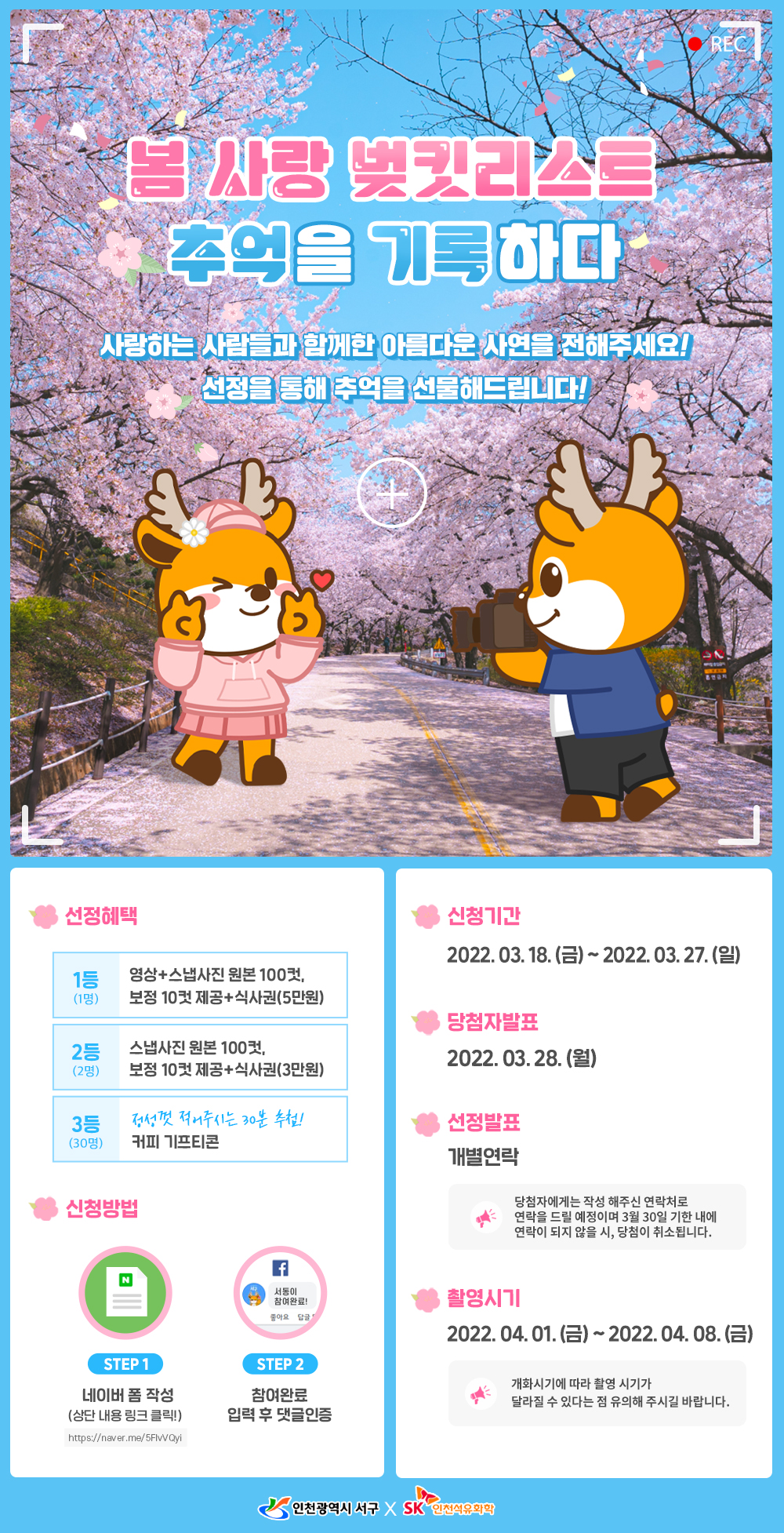 이번 캠페인은 서구와 SK인천석유화학이 함께 진행한다. 서구 관계자는 “벛꽃 명소로 잘 알려졌지만 코로나로 3년째 개방하지 못하는 SK인천석유화학 벚꽃동산을 주민에게 알리고 특별한 추억을 선물하기 위해 마련했다”고 설명했다.