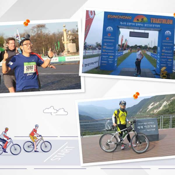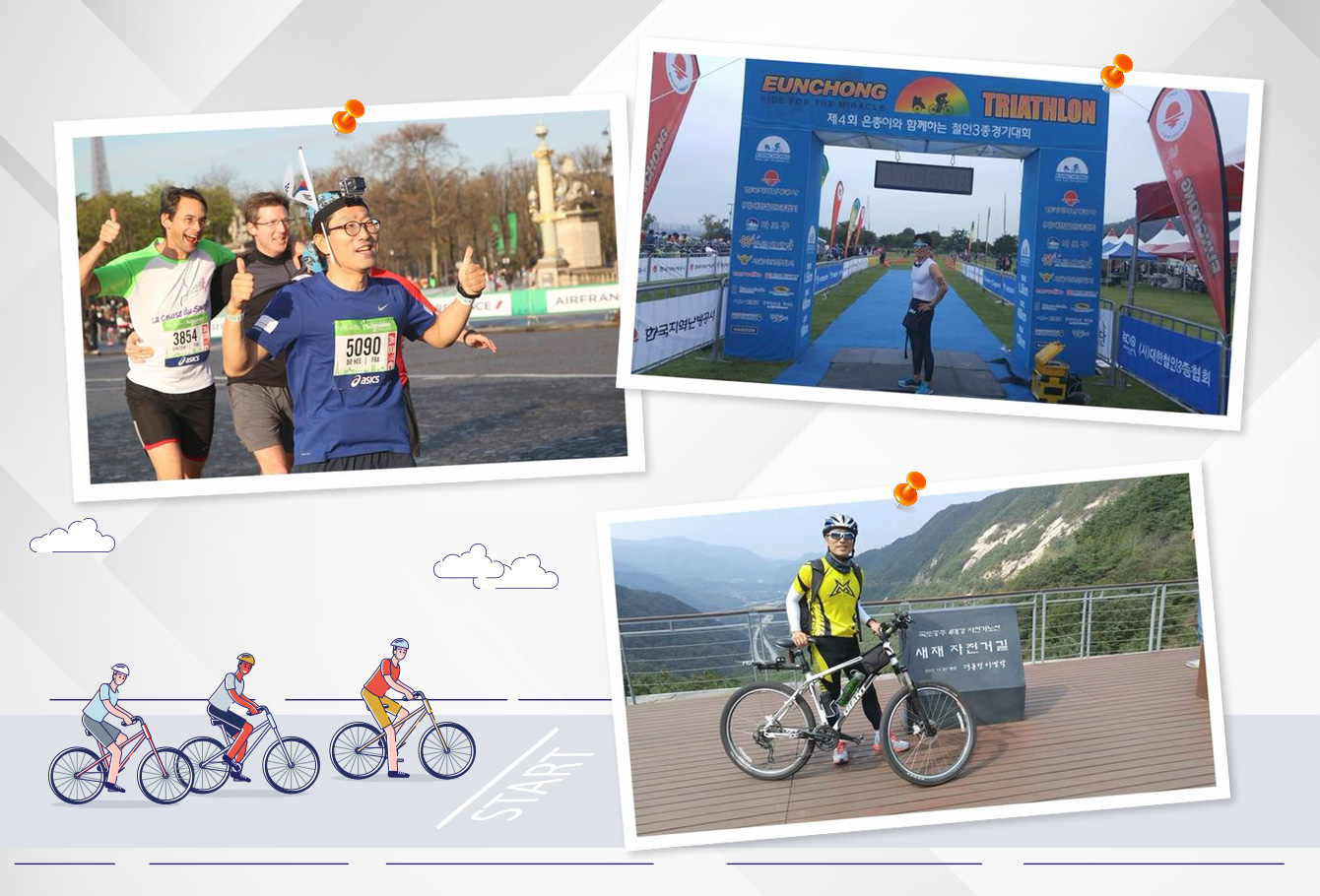 2016년에 파리 국제 마라톤과 국내에서 열린 철인 3종 경기에 참가했습니다. 그보다 1년 전인 2015년에는 자전거로 인천에서 부산까지 가는 국토종주에도 참가했고요.