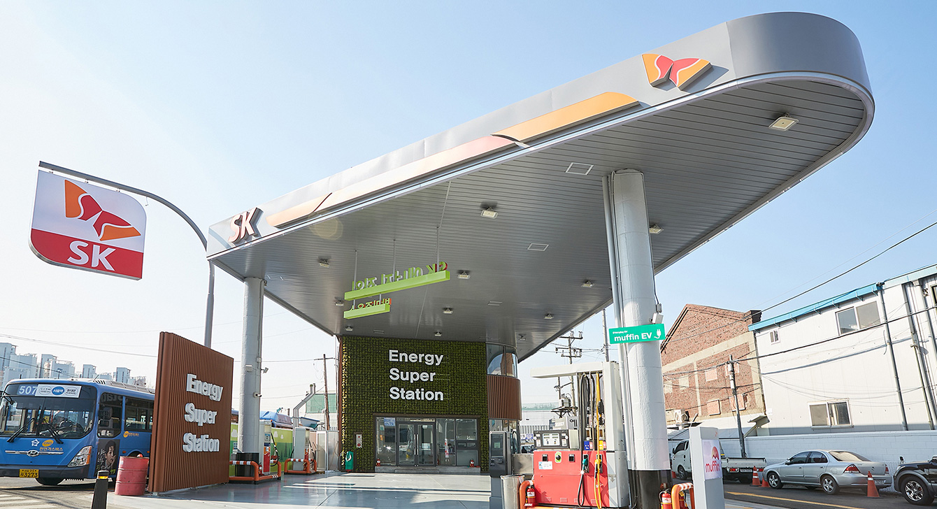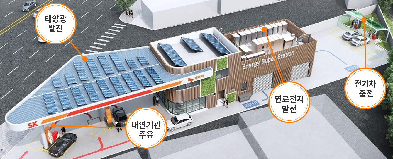 SK에너지는 2월 산업통상자원부와 추진한 분사 에너지 활성화 전략 과제로 국내 1호 ‘에너지 슈퍼스테이션’을 SK박미주유소에 개소했다. ‘에너지 슈퍼스테이션’은 주유소에 설치한 태양광, 연료전지 등 분산 전원을 통해 생산한 전기를 전기차 충전에 사용하는 주유소 기반 혁신 사업 모델이다.