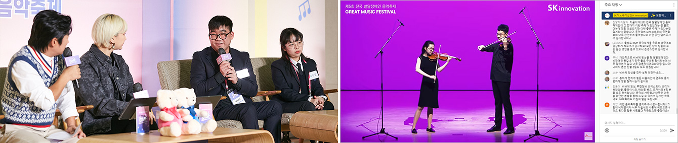 ▲ (좌) 2021년 10월 27일에 열린 제5회 GMF에서 방송인 이수근과 브라운아이드걸스 제아가 발달장애인 연주자들과 이야기를 나누고 있다. / (우) SK이노베이션 공식 유튜브 채널 생중계 채팅창에 실시간으로 게재된 발달장애인 음악단체 응원 댓글