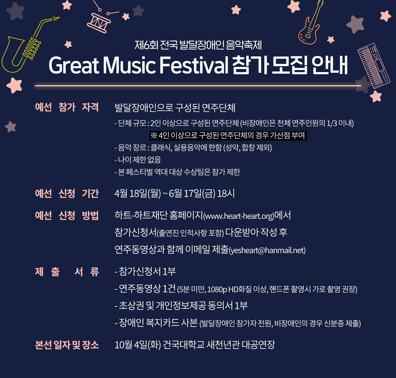 올해 GMF 본선 무대는 건국대학교 새천년관 대공연장에서 진행될 예정이며, 예선 접수 기간은 6월 17일(금)까지다. 하트-하트재단 공식 홈페이지(www.heart-heart.org)에서 참가 신청서를 다운로드 받아 작성 후 이메일(yesheart@hanmail.net)로 제출하면 된다.