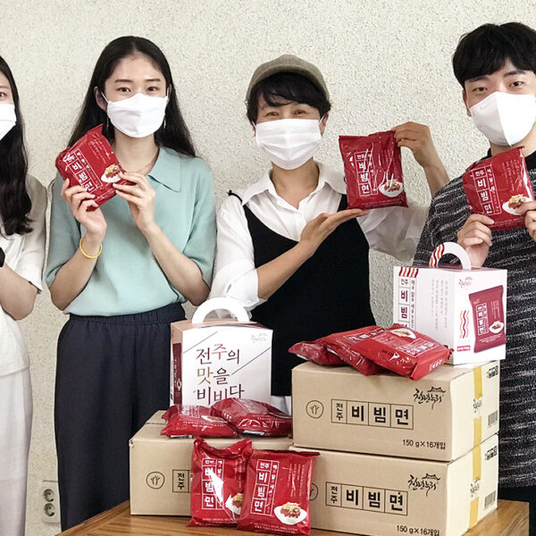(사진2) 사회적기업 ㈜천년누리 장윤영 대표(왼쪽에서 세 번째)와 직원들이 대표 상품인 전주비빔면을 들어보이고 있다.