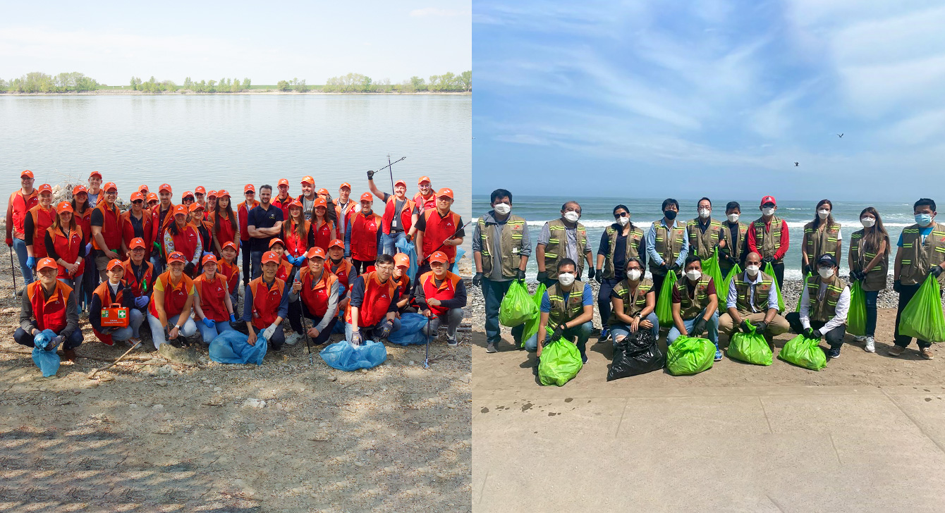 ▲ (좌) 4월 29일(현지 시간), 헝가리 다뉴브 강 인근에서 SK On Hungary 등 SK온의 현지 구성원들이 코마롬市에 소재한 자원봉사단체 KÖSZ와 공동 진행한 산해진미 플로깅 활동을 마친 후 단체사진을 촬영하고 있다. / (우) 4월 26일(현지 시간), SK어스온 리마 지사 구성원들이 페루 바랑코 해변 인근에서 산해진미 플로깅 활동을 마친 후 단체사진을 촬영하고 있다.