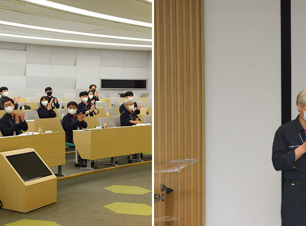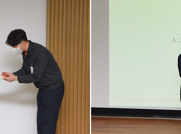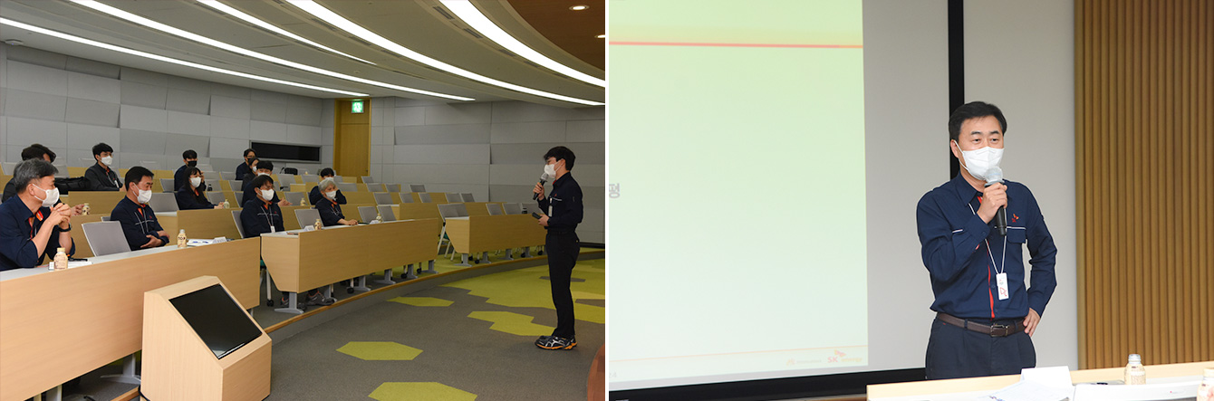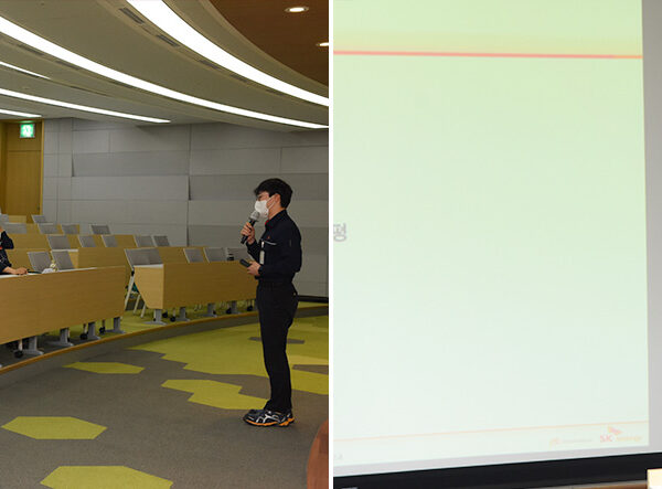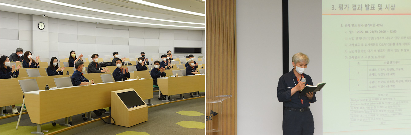 ▲ (좌) 4월 21일, 울산CLX 내 수펙스 홀에서 진행된 공정설계 과정 수료식에 참석한 신입 엔지니어와 담당 멘토들이 본격적인 행사에 앞서 아이스 브레이킹(Ice Breaking) 시간을 가지고 있다. / (우) 심사위원이 공정설계 과정 수료식에서 평가 결과 발표를 하고 있다.