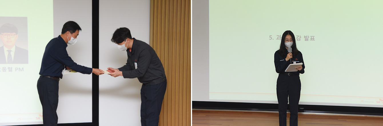 ▲ (좌) 공정설계 과정 수료식에서 SK에너지 박창길 Engineering본부장(왼쪽)이 신입 엔지니어(오른쪽)에게 시상하고 있다. / (우) 신입 엔지니어가 5주간 진행된 공정설계 과정을 성공리에 끝마친 소감을 발표하고 있다.