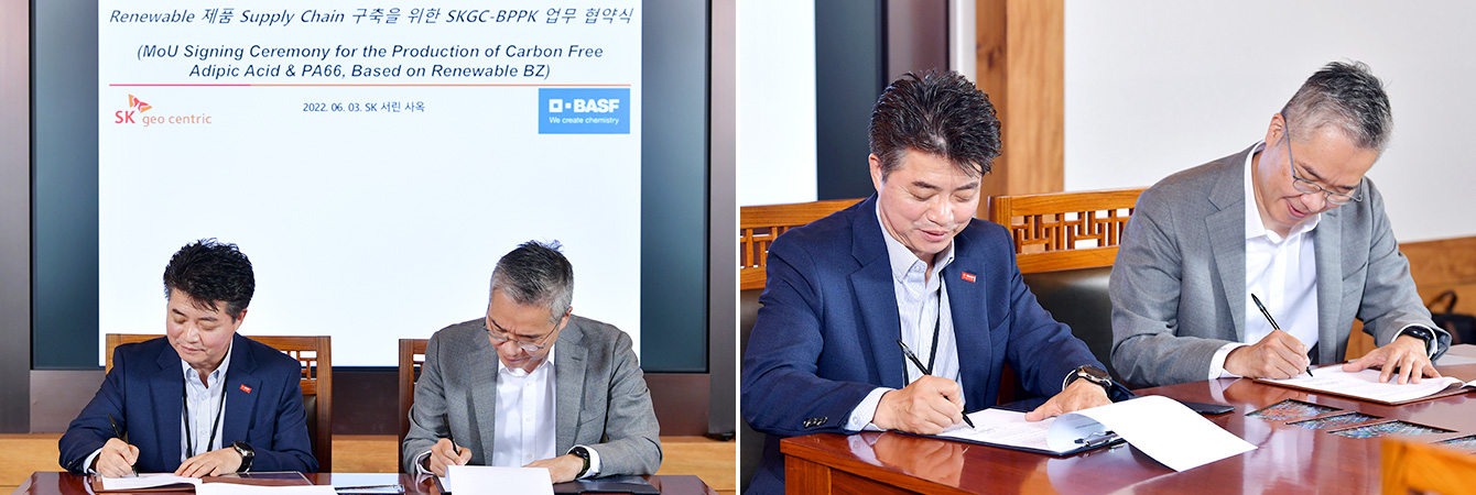 SK지오센트릭과 BPPK는 지난 6월 3일, 서울 종로구 소재 SK서린빌딩에서 리뉴어블 나프타**를 원료로 생산한 리뉴어블 벤젠(r-BZ) 제품 공급 계약을 위한 업무협약(MOU)을 체결했다. 이번 업무협약에 따라 SK지오센트릭이 리뉴어블 벤젠을 BPPK에 공급하면, 이를 원료로 BPPK가 에어백, 외장재와 같은 자동차의 주요 부품 소재를 만들어 완성차업체 등에 공급하게 된다.