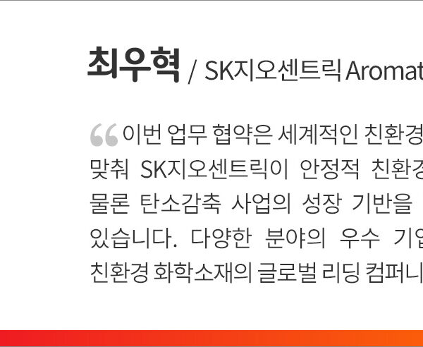 또한, SK지오센트릭은 SK이노베이션 계열이 2050년까지 탄소배출량을 모두 줄이겠다고 밝힌 넷제로(Net-Zero) 목표 달성을 위해 연간 23만 톤 이상 친환경 리뉴어블 나프타 활용을 확대하는 한편, 리뉴어블 제품 우수성을 바탕으로 향후 성장잠재력이 큰 아시아 지역을 중심으로 파트너십을 확대해 나갈 예정이다.