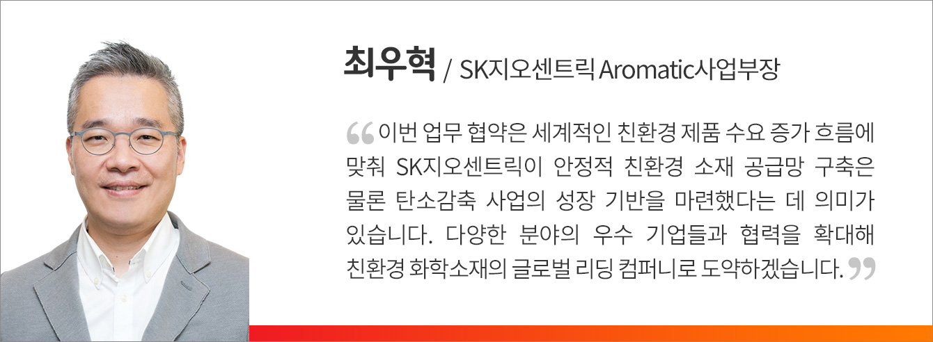 최근 전기차, 수소차와 같은 친환경 제품 수요가 크게 늘어나면서, 탄소배출을 줄이는 친환경 소재에 대한 필요성도 덩달아 높아지고 있다. SK지오센트릭과 BPPK는 이번 업무협약을 통해 생산과정에 필요한 원료인 벤젠을 리뉴어블 벤젠으로 대체 및 제품을 생산함으로써, 양사가 전방위적인 친환경 소재 공급망을 구축하는 데 중추적인 역할을 맡겠다는 것에 그 의미가 있다.
