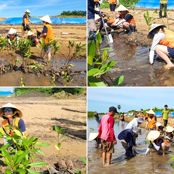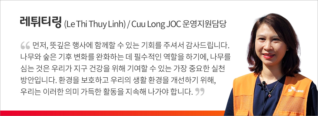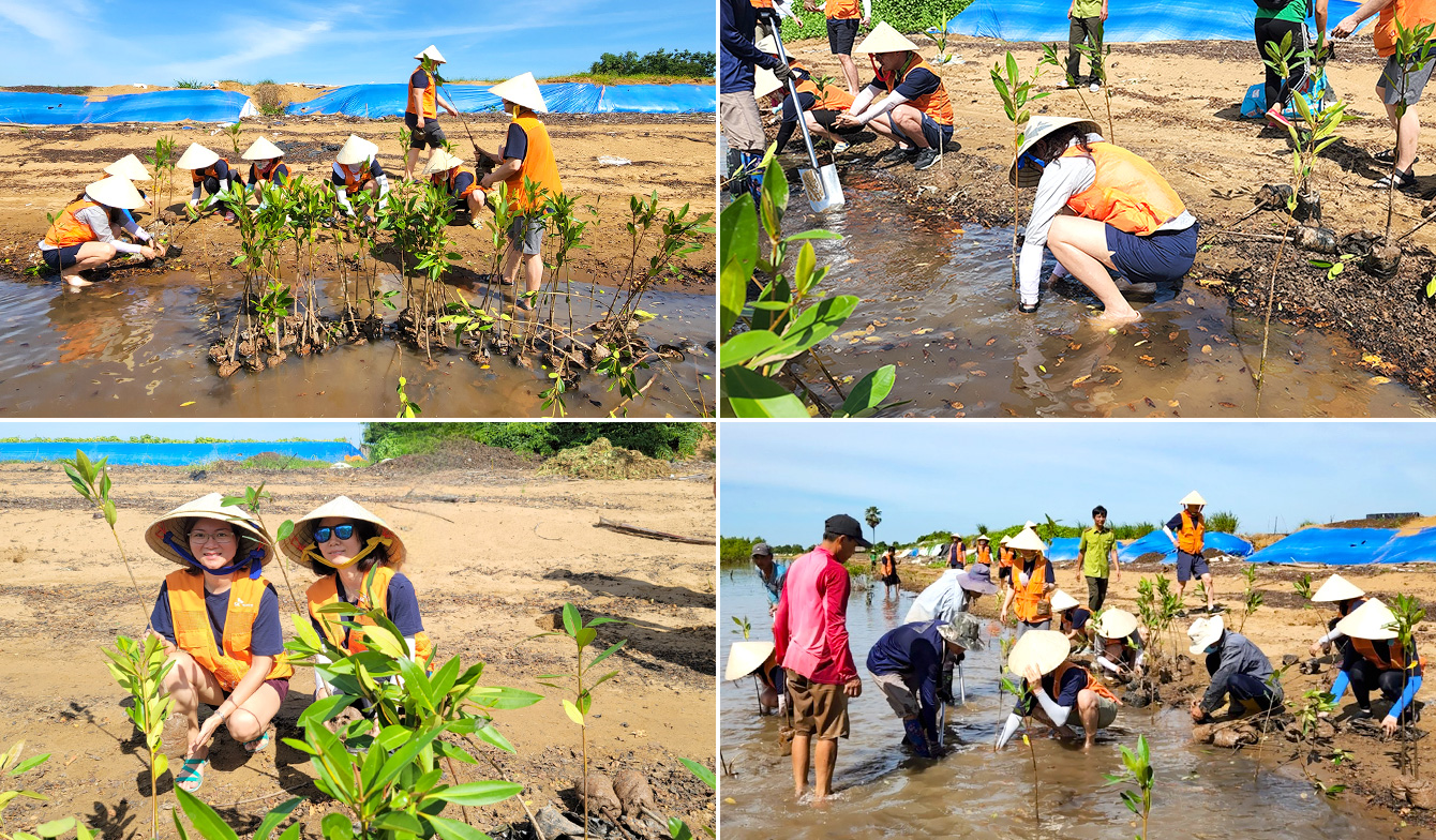기부금 전달식을 마친 후 SK이노베이션과 SK어스온 호치민지사 구성원, 그리고 베트남 현지 파트너社 구성원 등 30여 명은 짜빈성 꺼우응앙현(Cầu Ngang District) 일대에서 맹그로브 묘목 식수 활동을 진행했다. 이날 현지의 무더운 날씨가 무색할만큼 자원봉사자들은 함께 힘을 모아 열과 성을 다해 맹그로브 묘목 1천 그루를 심었다.
