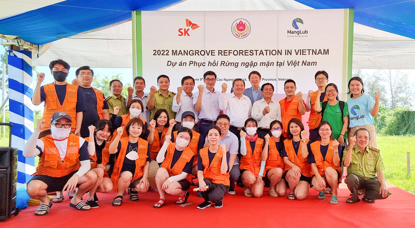 이날 SK이노베이션은 CES 2022에 참여한 SK그룹을 대표해, 맹그로브숲 복원사업을 위한 기금 1억원을 전달하는 행사를 가졌다. 이 자리에는 짜빈성 인민위원회 응웬중황(Nguyen Trung Hoang) 부위원장, 짜빈성 농업농촌개발국 레광랑(Le Quang Rang) 부국장, SK이노베이션 임수길 밸류크리에이션센터장, 사회적기업 맹그러브 김항석 대표를 비롯해 현지 파트너社인 베트남 국영 석유회사 PVEP(Petro Vietnam Exploration & Production), 베트남 해상광구 공동운영사 쿠롱(Cuu Long) JOC 및 SK어스온 호치민지사 구성원 등 30여 명이 참석했다.