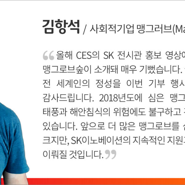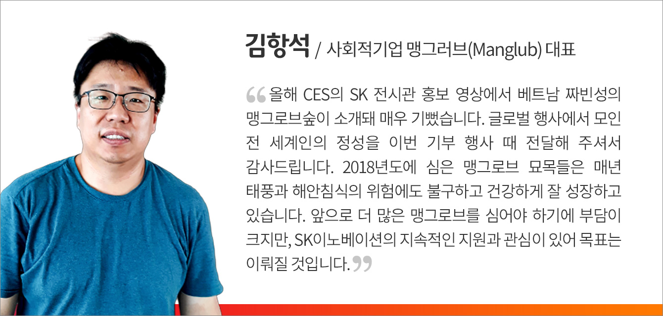 SK이노베이션의 모든 구성원은 ‘1% 행복나눔’ 기금 조성에 동참하고 있으며, 이를 통해 맹그로브숲 복원사업에 적극 참여하고 있다. 이에 더해 CES 2022 현장을 찾은 전 세계 사람들이 맹그로브숲 복원에 관심을 갖고 뜻을 같이하게 된 것은 매우 의미 있는 일이 아닐 수 없다. SK이노베이션은 회사가 베트남 현지에 설립 지원한 사회적기업 ‘맹그러브(Manglub)*’를 통해 코로나 팬데믹 상황에서도 꾸준하게 맹그로브숲 복원사업을 진행해 왔고, 최근에는 이를 주목한 독일 및 프랑스 대형해운사에서도 동참하겠다는 의향을 보내오기도 했다.