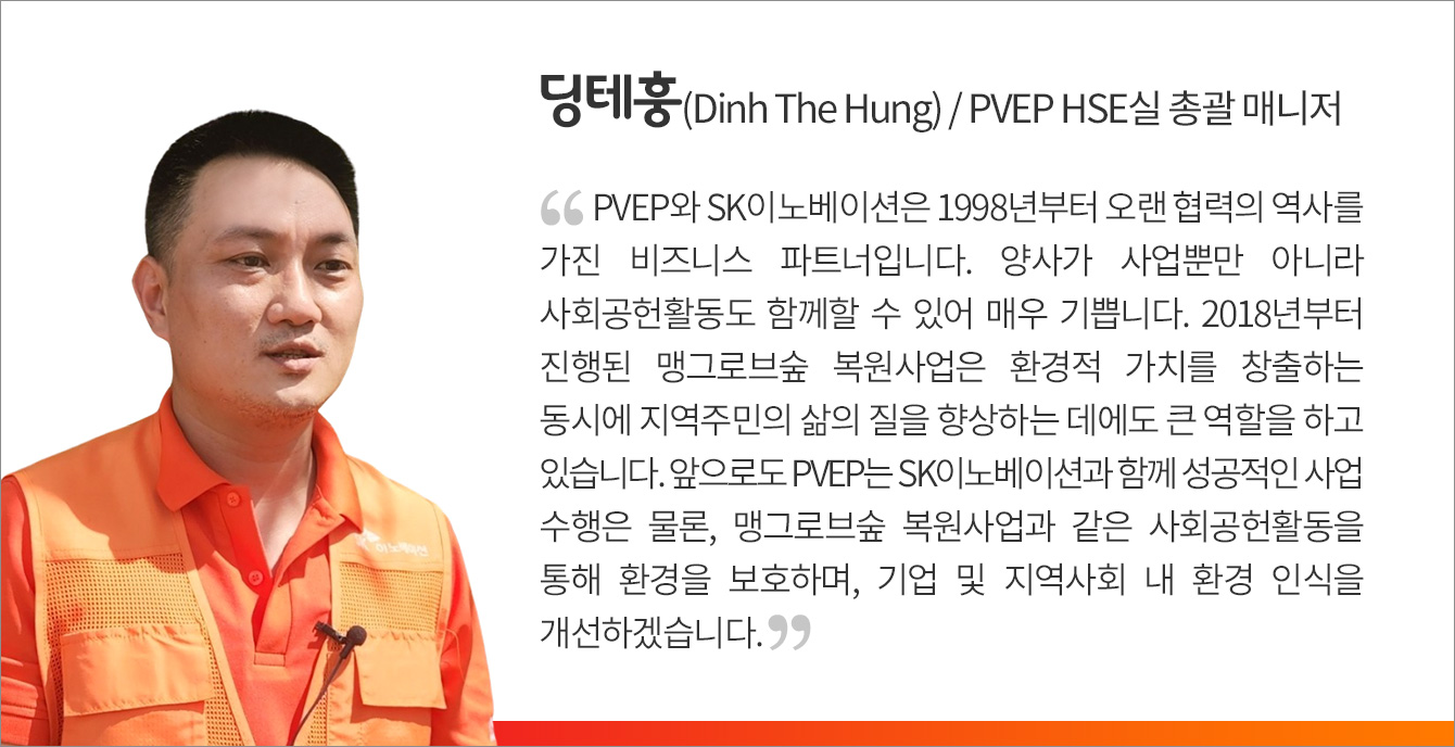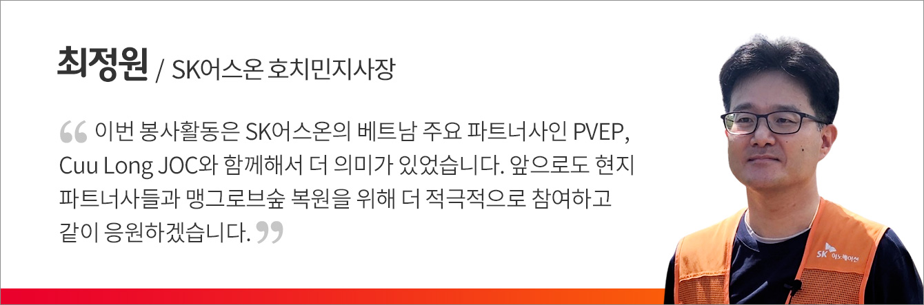 이번 식수 활동에는 짜빈성 지역정부 대표뿐만 아니라, SK어스온의 글로벌 파트너社인 PVEP와 Cuu Long JOC 구성원도 함께 자원봉사활동에 참여했다. 이 두 기업은 현재 SK어스온과 손잡고 베트남 해상광구를 운영 중이다. 특히, PVEP는 2019년부터 여러 차례 맹그로브 식수 활동을 함께한 바가 있으며, SK이노베이션과 같이 베트남에서 적극적으로 환경보호활동을 펼치고 있다. 올해 처음으로 참여한 Cuu Long JOC도 이번 행사를 기점으로 SK이노베이션과 함께 맹그로브숲 복원활동을 점차 확대해 나갈 예정이다. 현지에서 사업을 공동으로 추진하면서 환경/사회적가치 또한 함께 창출한다는 것은 매우 고무적인 일이며, 진정한 글로벌 파트너십이라고 할 수 있다.