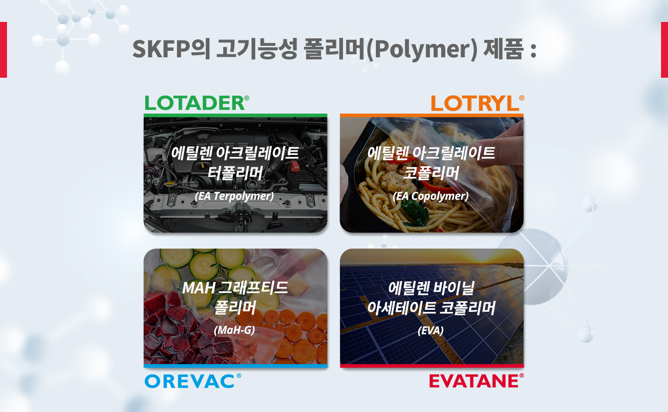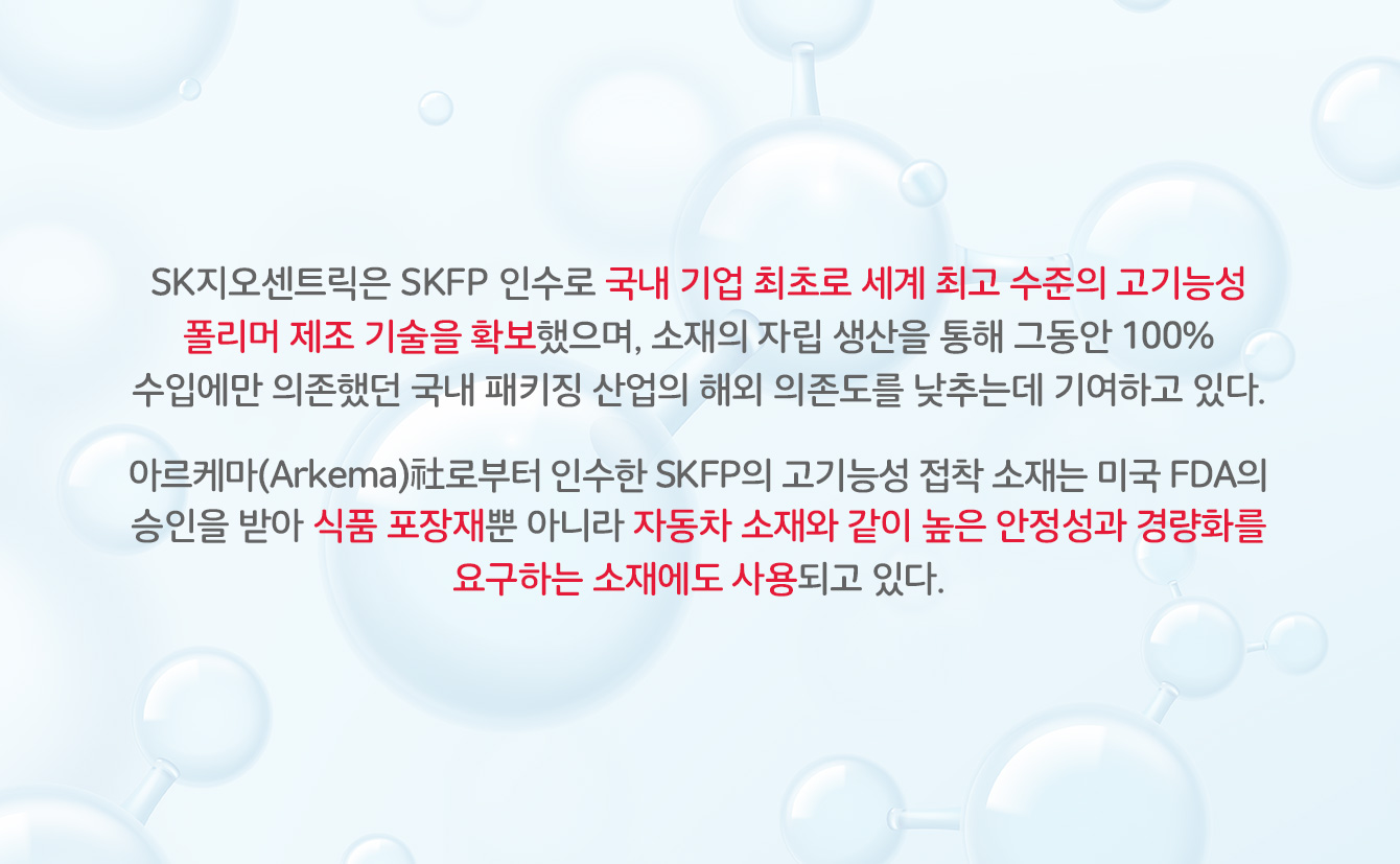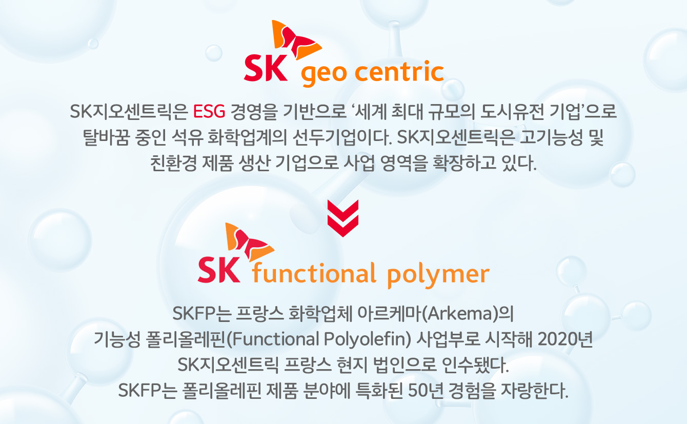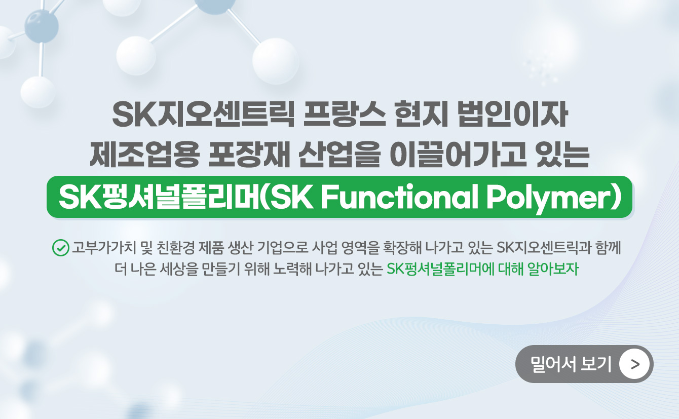 SK지오센트릭 프랑스 현지 법인이자 제조업용 포장재 산업을 이끌어가고 있는 SK펑셔널폴리머(SK Functional Polymer, 이하 SKFP)는 품질면에서 우수하면서도 친환경적인 브랜드와 제품을 보유하고 있다. SKFP가 가진 기술력으로 만들어진 다양한 폴리머(Polymer) 제품들과 더 나은 세상을 만들기 위해 노력해 나가고 있는 SKFP에 대해 알아보자.