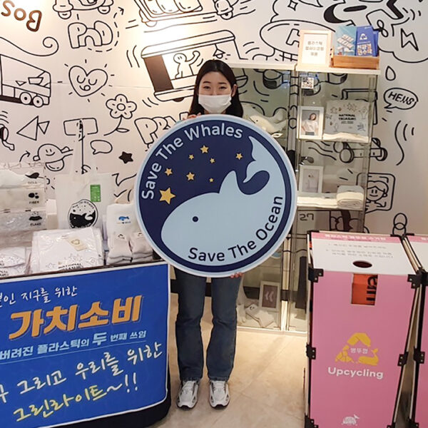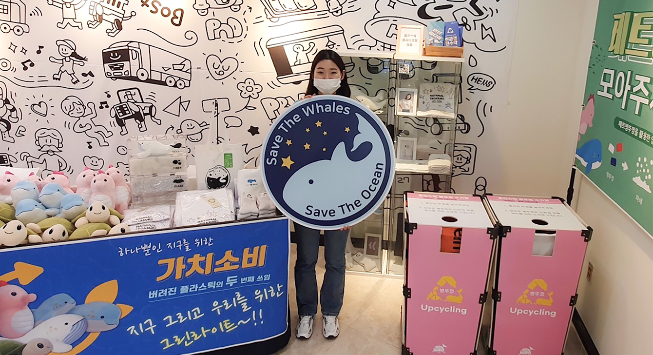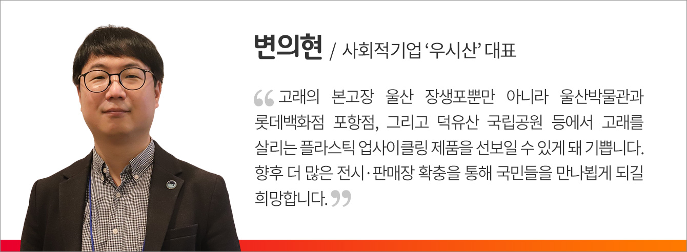 SK이노베이션이 육성 지원하는 ‘우시산은’ 고래 뱃속으로 들어가는 폐플라스틱을 업사이클링*해 인형/의류/가방 등 친환경 제품을 만들어 고래를 비롯한 해양생물을 구하고, 바다를 지켜 아름다운 지구 환경을 후손들에게 물려주자는 취지로 설립된 폐플라스틱을 수거/재활용하는 친환경 사회적기업이다.