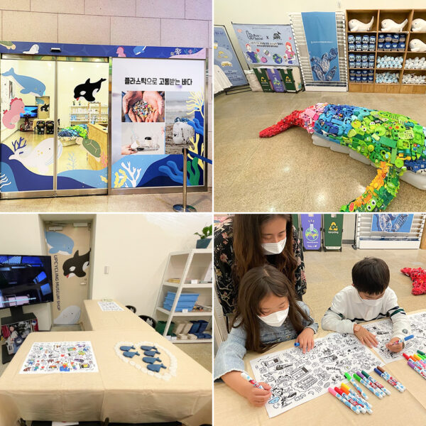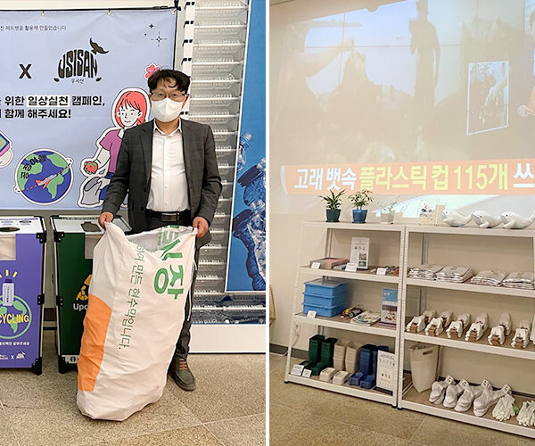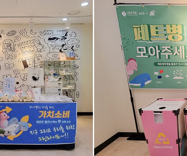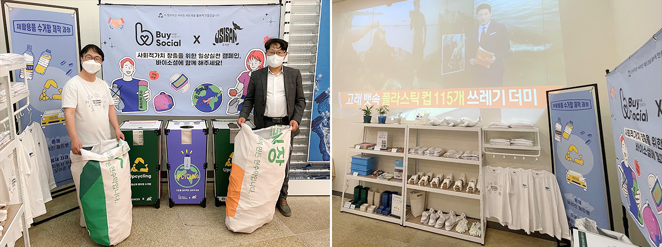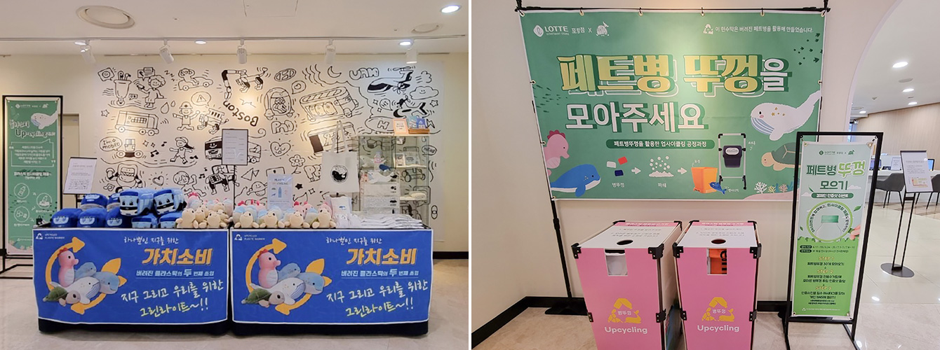 ▲ 롯데백화점 포항점에 오픈한 친환경 사회적기업 ‘우시산’의 단독 팝업스토어에 설치된 친환경 현수막, 배너(좌)와 페트병 뚜껑 모으기 챌린지(우)