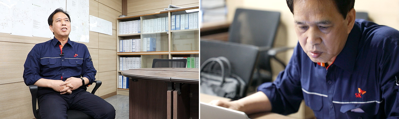 ▲ (좌) SK에너지 김정목 과장이 인터뷰를 진행하고 있다. / (우) 후배들을 위해 교육영상 자료를 준비 중인 SK에너지 김정목 과장