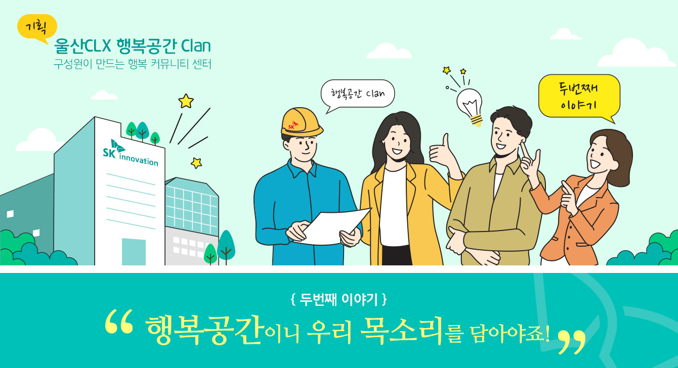 SK이노베이션 울산Complex(이하 울산CLX)에 새롭게 들어설 ‘행복 커뮤니티 센터(행복 Community Center, 이하 행복 CC)는 ‘행복’을 가장 앞 단에 품고 있다. 건축물의 이름 자체부터 정체성을 명확히 하고 있는 셈이다. 구성원들이 행복을 느낄 수 있는 공간, 나아가 지역사회와의 소통이 이뤄지는 곳. 어떤 콘텐츠로 이 정체성을 세울 수 있을지 해법을 찾아낼 적임자는 결국 당사자인 울산CLX 구성원들이다. 그들이 ‘행복공간 Clan’이라는 이름으로 머리를 맞대고 함께 해결 방안을 찾아가는 여정에 나서고 있다. 세대공감, 직위호칭 개선에 이은 울산CLX 행복협의회의 세 번째 활동이다. 이제 행복공간 Clan이 구성원의, 구성원에 의한, 구성원을 위한 행복 CC의 설계도를 그려간다.