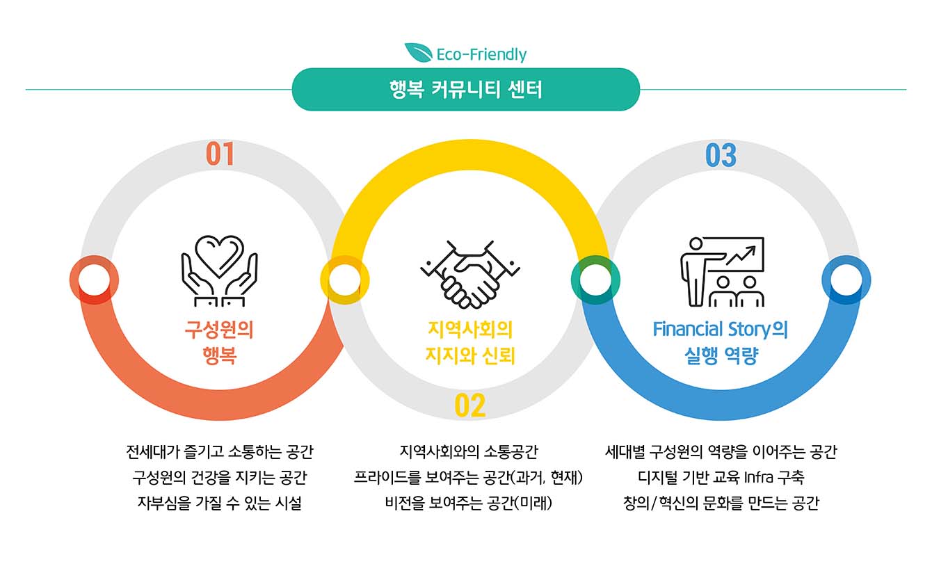 행복 CC 건립에 앞서 따라붙는 물음표는 꼬리에 꼬리를 문다. 하지만 결국 하나로 통한다. 구성원의 행복과 복지를 위한 공간이라는 것, ‘행복’이라는 두 글자에 방점이 찍혀 있다는 사실이다. 구성원에게 딱 맞는 공간 구성으로 활용도를 높이고, 지역사회와 공유 인프라로써 상생의 가치가 더해지며, 행복 스토리가 있는 플랫폼! 행복 CC는 어떤 모습으로 탄생할까.