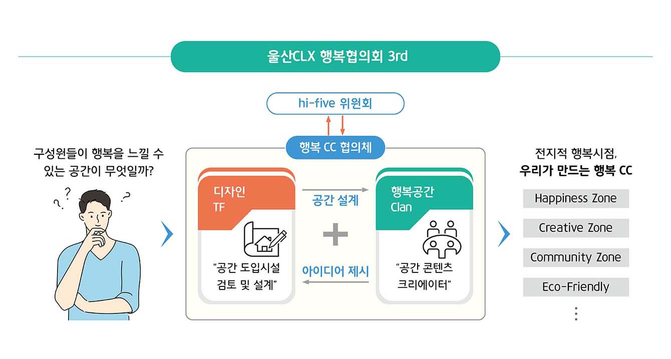 울산CLX는 회사와 구성원이 함께 더 큰 행복을 만들어 가자는 모토로 ‘울산CLX 행복협의회’라는 기구를 운영하고 있다. 노사가 ‘행복’을 테마로 공식기구를 운영하는 것은 대한민국은 물론 해외에서도 전례를 찾아보기 어렵다. 그만큼 ‘행복’에 대한 열망이 크다는 방증이다. 2020년 첫 번째 의제로 ‘세대공감’을 위한 조직문화 혁신을 진행했고, 2021년에는 ‘직위호칭 개선’ 의제를 성공적으로 마무리하면서 구성원들이 행복을 스스로 고민하고 바람직한 문화를 만들어 나가는 ‘New SK이노베이션’의 토대를 더욱 단단히 다져왔다. 그리고 올해 ‘행복공간’을 향한 세 번째 여정을 시작하게 됐다. 이 프로젝트들을 추진하는 주체는 국내외의 내로라하는 컨설팅 회사도 아니고 회사에서 특별 임무를 부여받은 별도의 전문가들도 아니다. 바로 구성원들 자신이다.