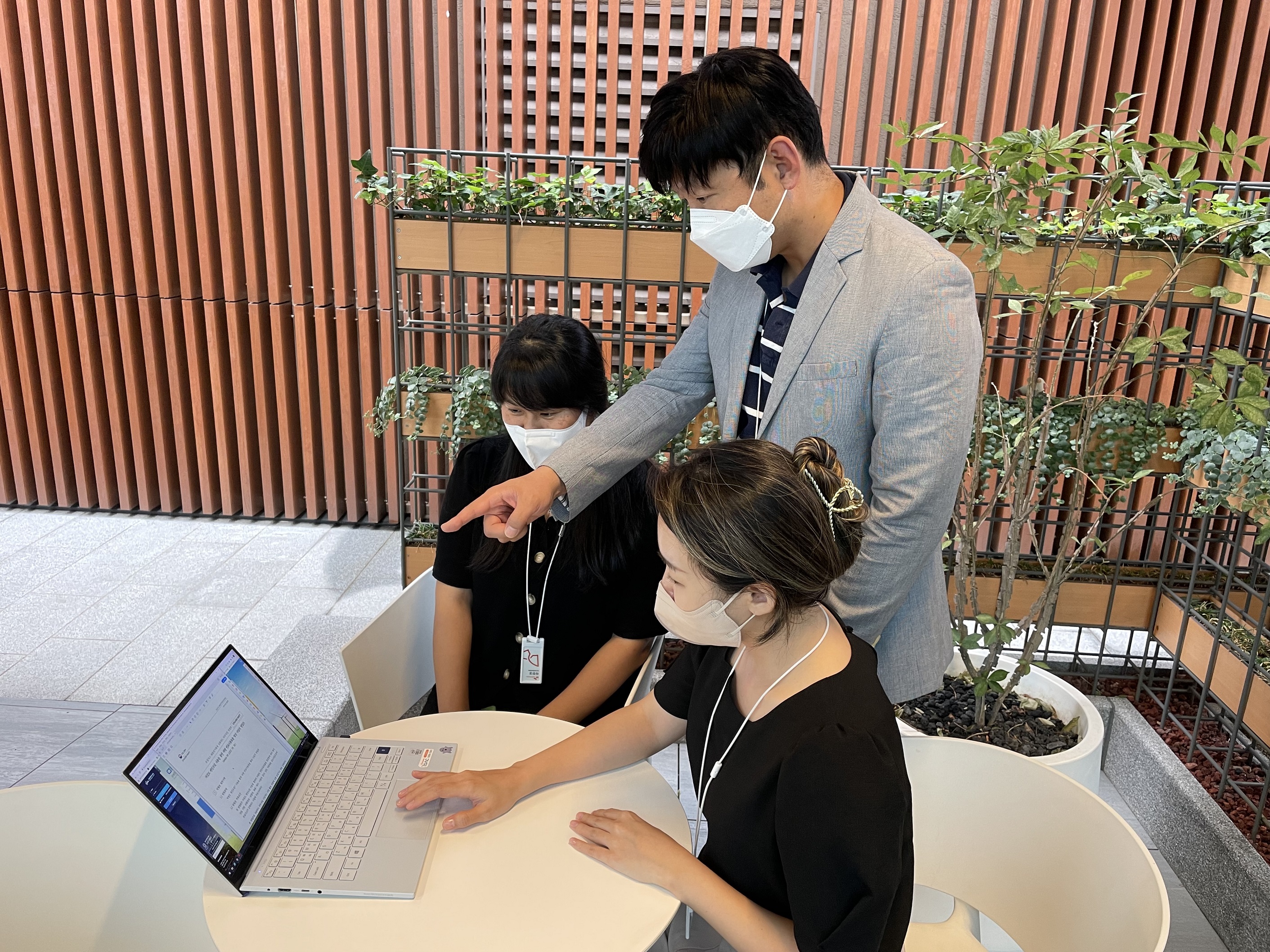 (사진 1) SK루브리컨츠 구성원들이 환경부 탄소감축 관련 사이트(상쇄등록부시스템)에서 SK루브리컨츠가 개발한 저점도 엔진오일 관련 외부사업 방법론을 확인하고 있다