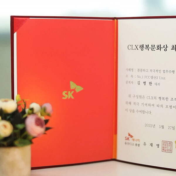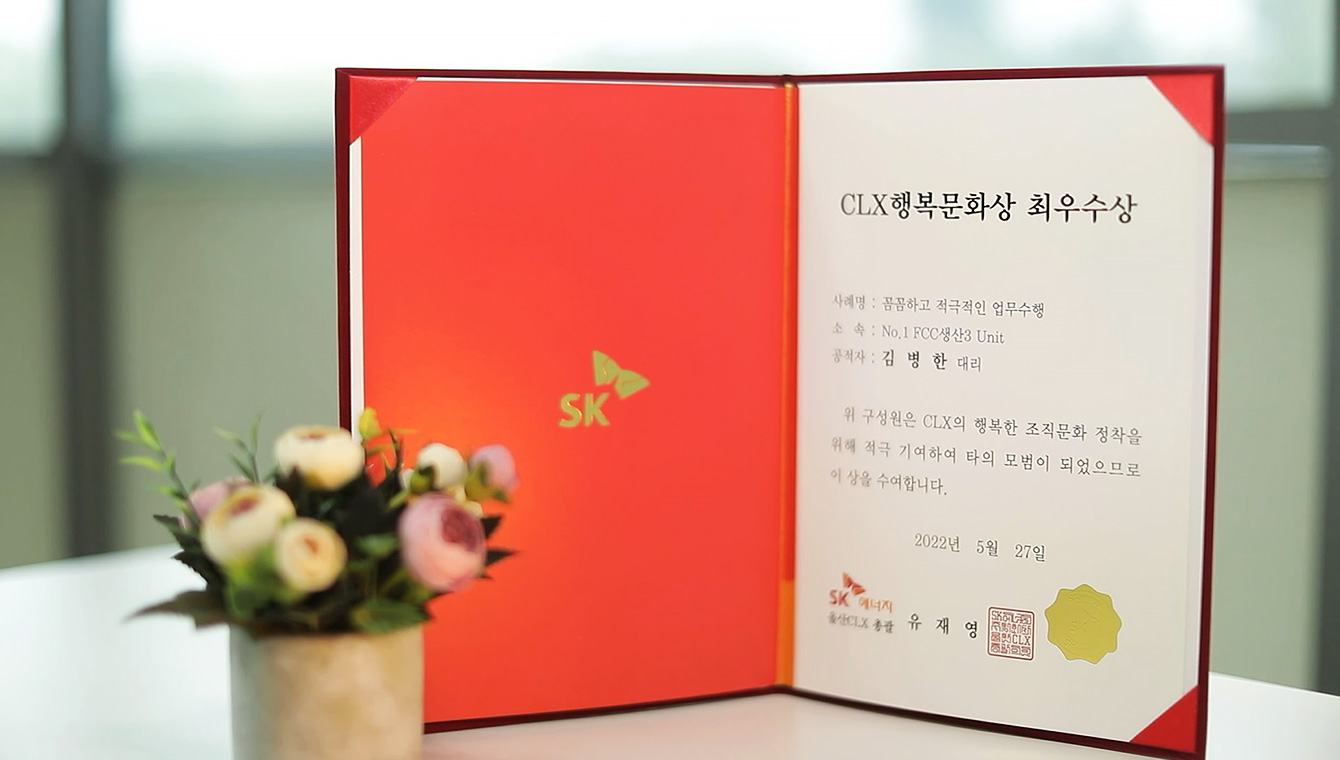 ▲ SK에너지 No.1 FCC생산3 Unit 김병한 대리가 수상한 CLX행복문화상 최우수상 표창
