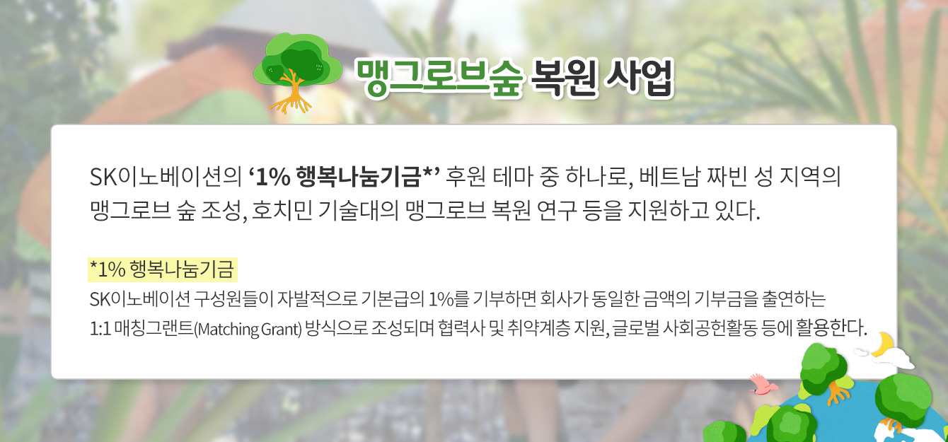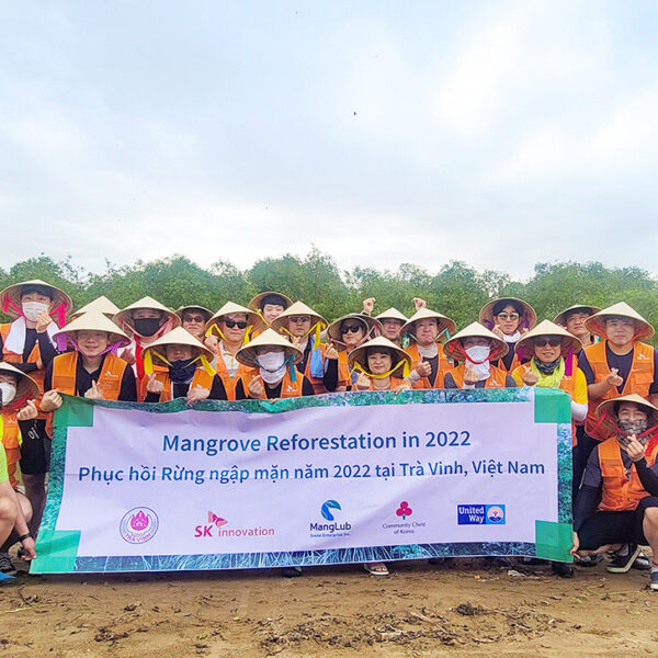베트남 현지 시간으로 9월 19일, SK이노베이션 울산 Complex(이하 울산CLX) 구성원 21명은 베트남 짜빈성을 찾아 맹그로브 묘목 2천여 그루를 심는 봉사활을 수행했다. 울산CLX는 매년 1억원 규모의 1% 행복나눔기금을 출연하는 등 맹그로브숲 복원사업에 꾸준히 참여해 오고 있다.