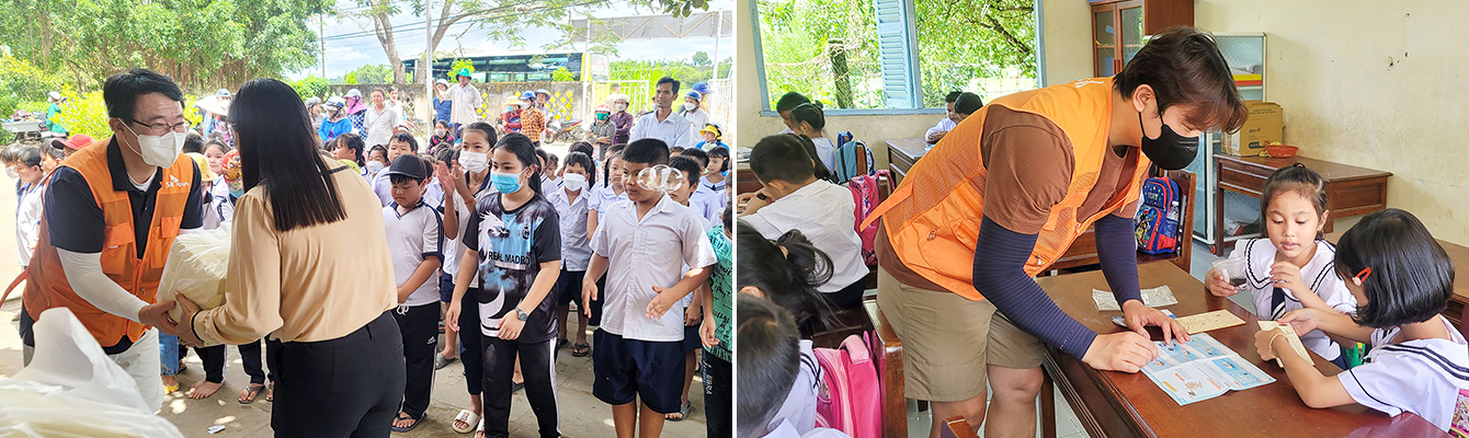 ▲ (좌) 9월 20일, SK에너지 박성길 원유·제품운영실장(왼쪽)이 미롱남 초등학교 교사(오른쪽)에게 학용품과 간식을 전달하고 있다. / (우) 울산CLX 구성원 자원봉사자가 미롱남 초등학교 아이들과 함께 만들기 활동을 하고 있다.