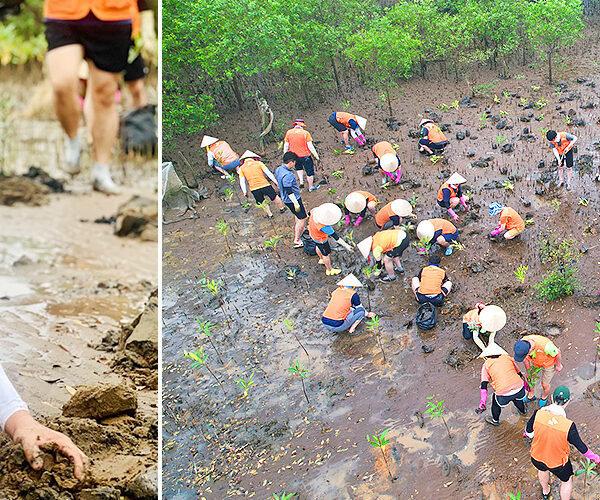 ▲ 9월 19일, 울산CLX 구성원 자원봉사자들이 베트남 짜빈성 일대에서 맹그로브 묘목을 심고 있다.